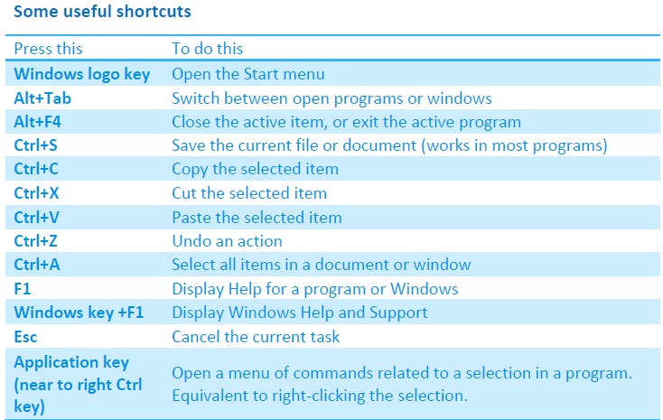 Keyboard shortcuts are ways to perform actions by using your keyboard. They're called shortcuts because they help you work faster. In fact, almost any action or command you can perform with a mouse can be performed faster using one or more keys on your keyboard. A plus sign (+) between two or more keys indicates that those keys should be pressed in combination.